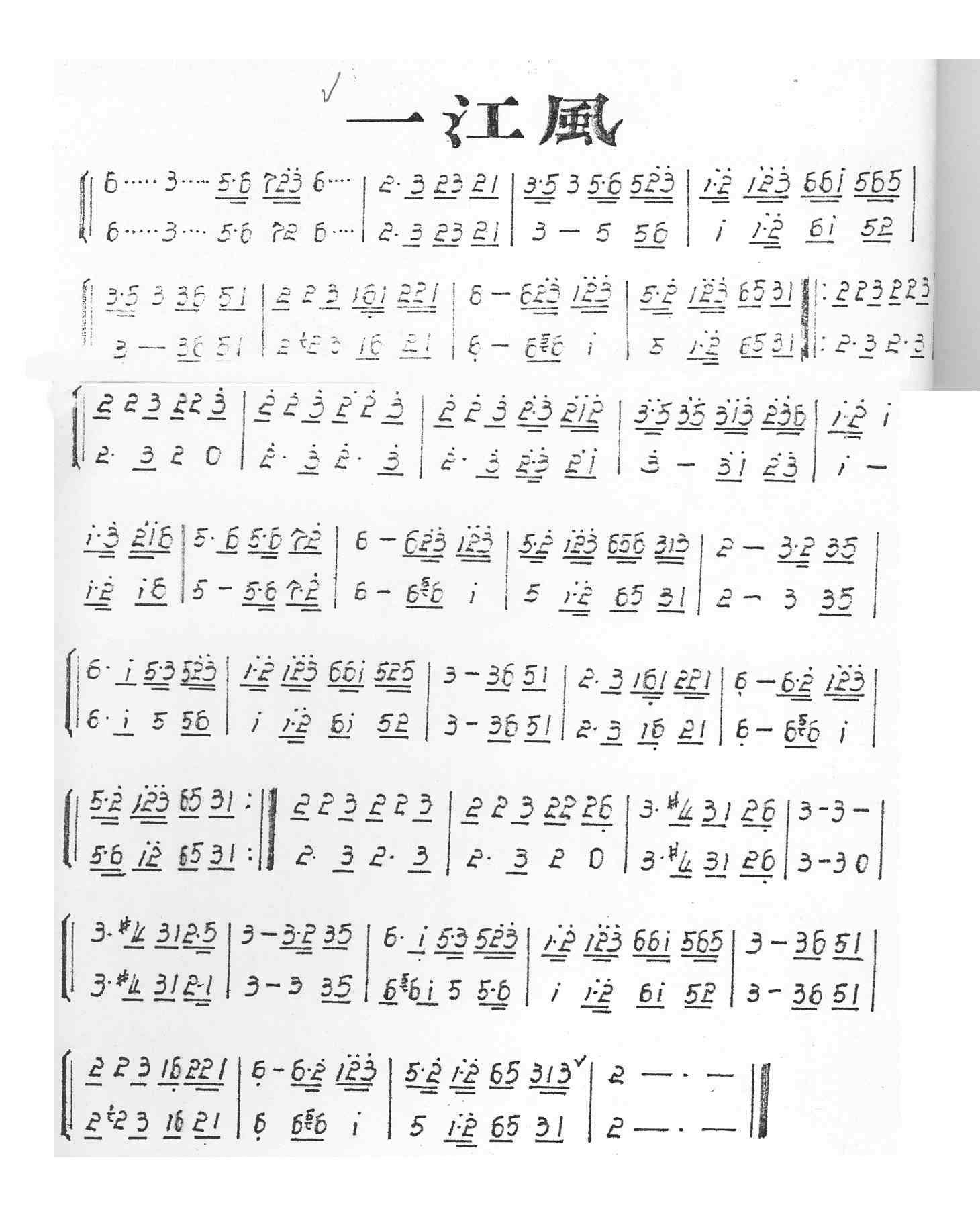 notation chiffrée, avec titres et paroles éventuelles en chinois. Dans quelques pièces la mélodie est suivie de notation pour percussions |