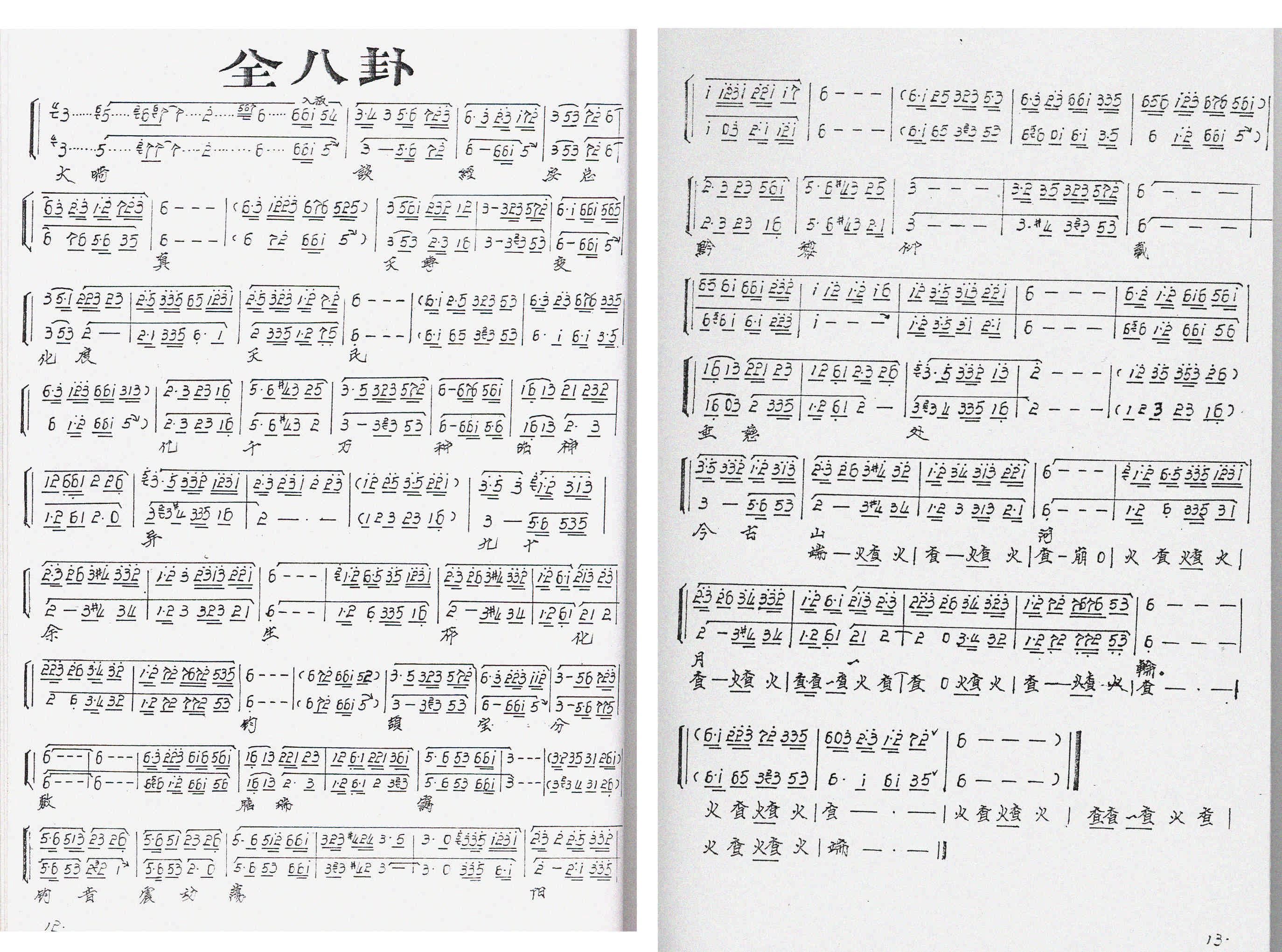 Commentaire public notation chiffrée, avec titres et paroles éventuelles en chinois. Dans quelques pièces la mélodie est suivie de notation pour percussions