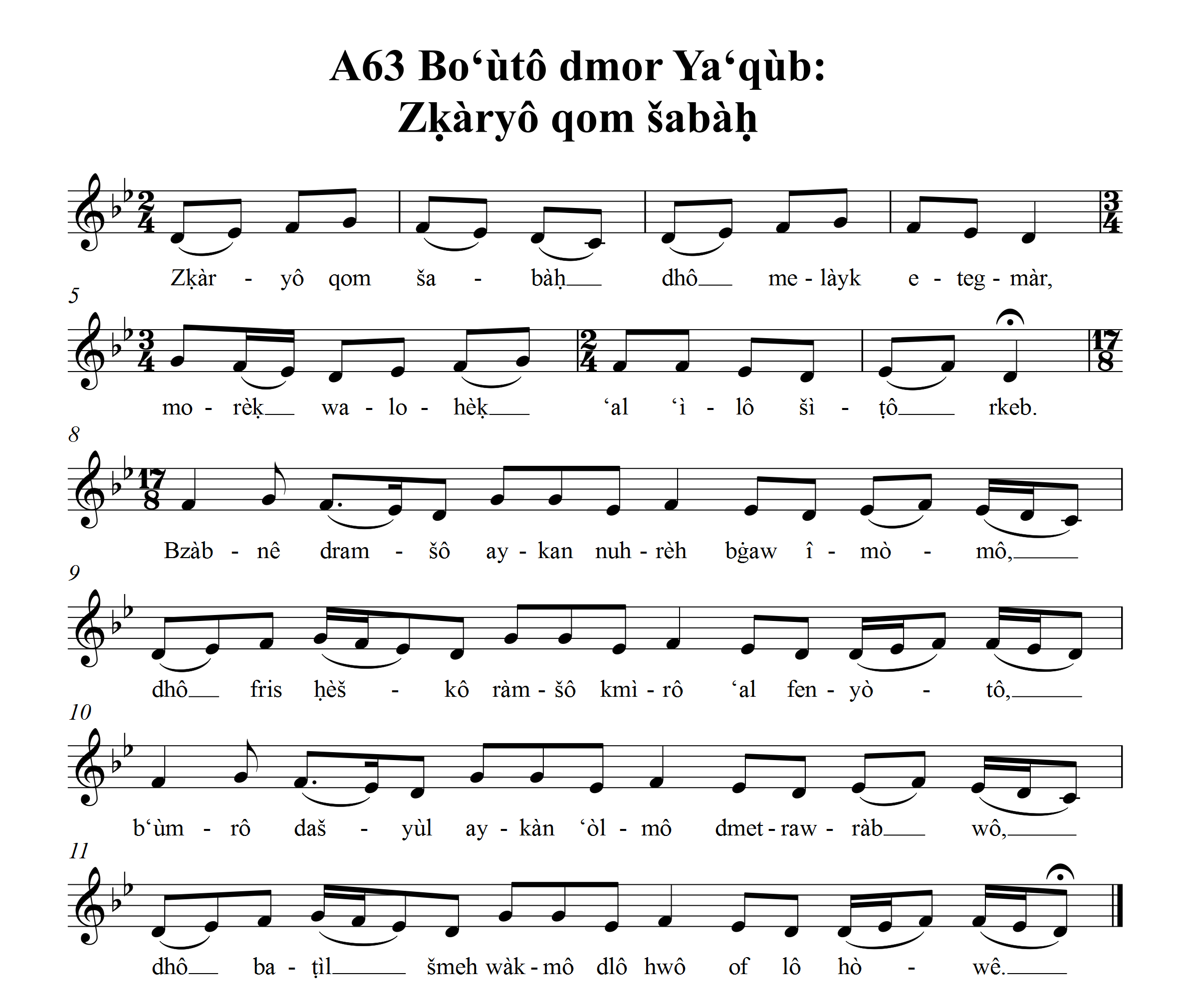 A63 Bo‘ùtô dmor Ya‘qùb: Zḳàryô qom šabàḥ